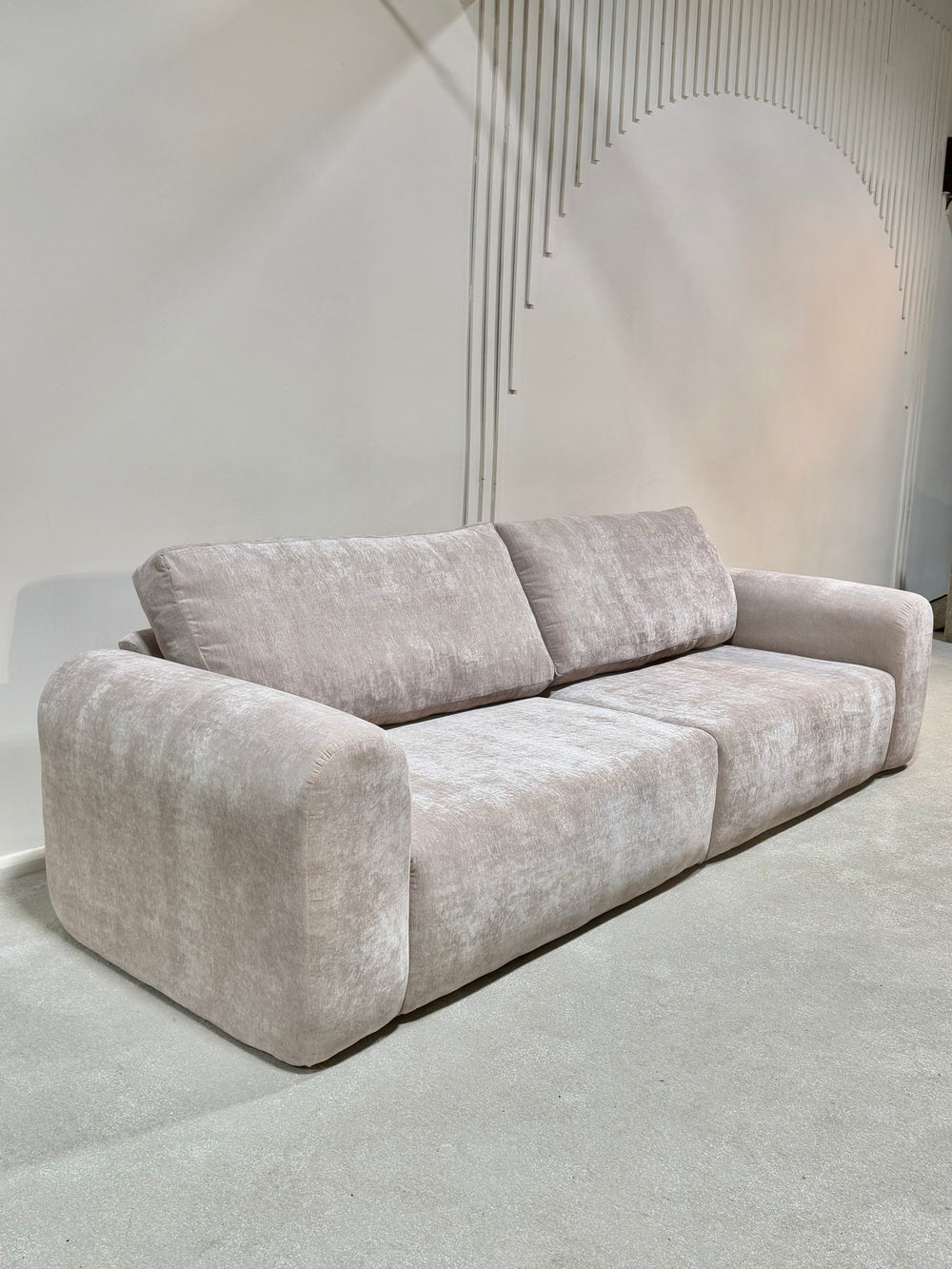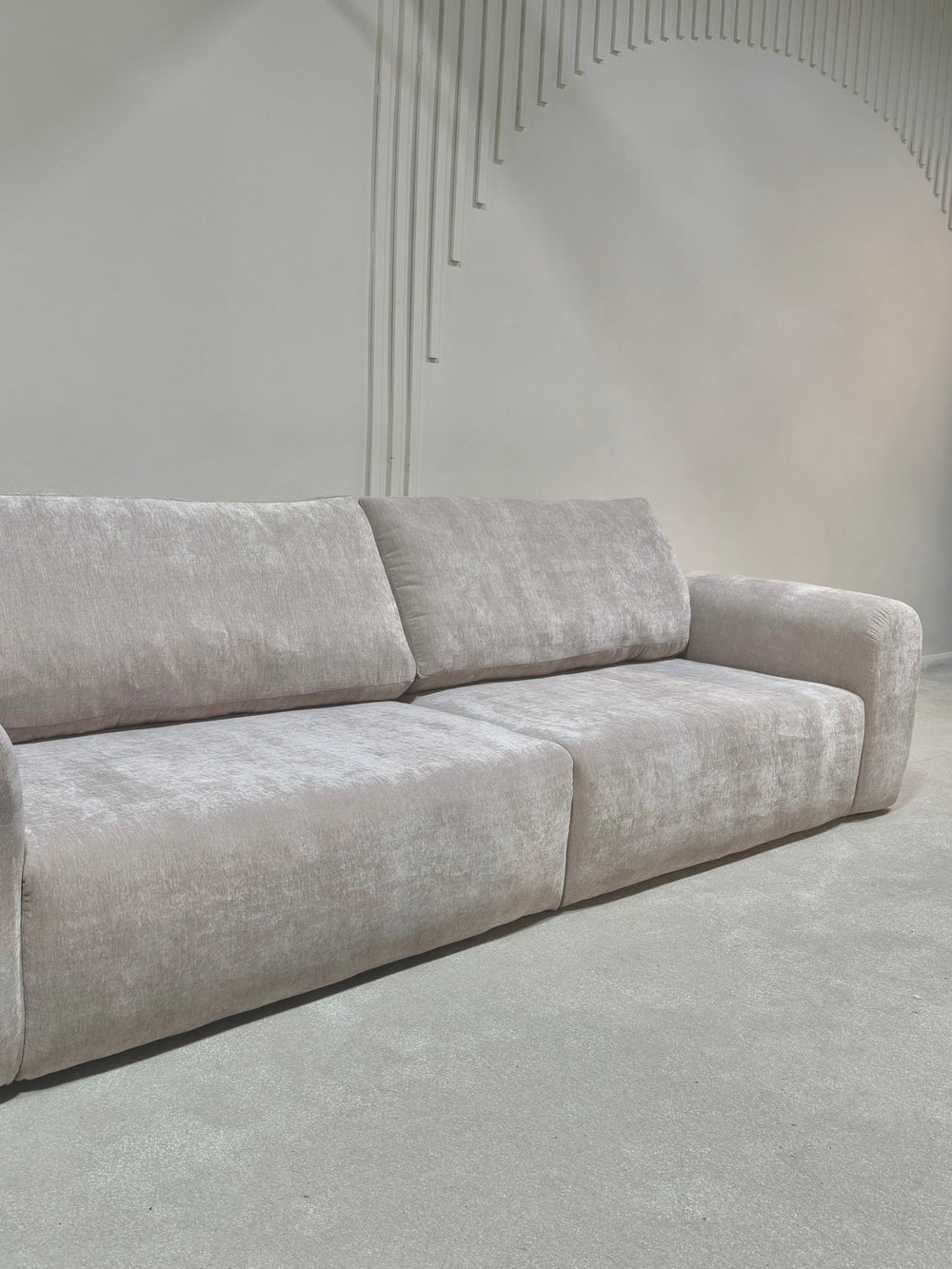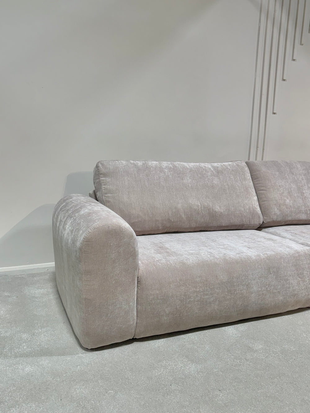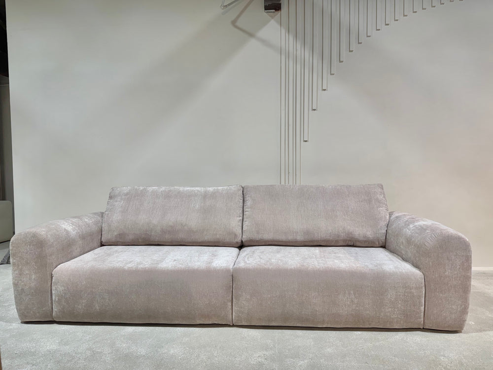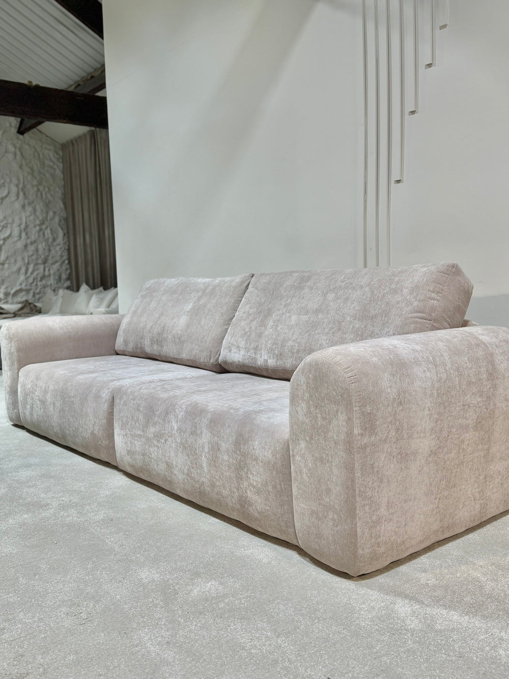 Upholstered in a luxuriously soft velvet/chenille-like fabric, the sofa has a subtle, tactile finish that catches light beautifully while remaining warm and matte to the touch. The fabric’s gentle texture adds depth and richness without overpowering the clean silhouette, making Brooklyn equally suited to minimalist interiors and layered, lived-in spaces.